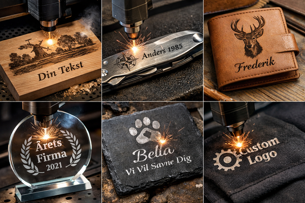Vi tilbyder præcis lasergravering på forskellige materialer som træ, metal, læder, glas og sten. Med avanceret laserteknologi kan vi gravere logoer, navne, designs og personlige budskaber direkte i materialet.